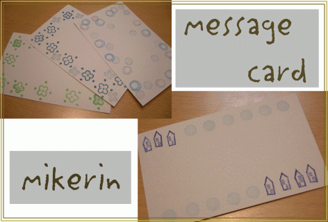 小さいハンコをいくつか彫ったので、メッセージカードにしてみました。 いまいち可愛くないかも...捺し方と色を工夫したら可愛く使えるかな~?? イラストを消しゴムに転写済みの、彫ってくれるのを待っているハンコたちがけっこういます。机が届いてやる気になったら一気に彫りたいところです。でも、その時に彫りたかったものって、今は彫る気にならない絵だったりするんですよね。その時にやらないとはんけしくんが無駄になっちゃいそう。もったいないからやる気を出さねば! ・-・-・-・-・-・-・-・-・-・-・-・-・-・-・-・-・-・-・-・-・-・-・-・-・-・ 今日はこれからお腹の張りがやっぱり気になるので病院に行ってまいります。なんでも無いってドクターに言ってもらえるだけでホッとするので...受診料もバカになりませんが、安心のほうが大切かと... 同じお医者さんでも旦那様に言われるのと、専門医に言われるのはやっぱり違う...でも、普段は頼りにしてますよ。(旦那様へ)