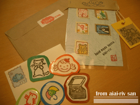 先日、カウプレの参加賞を送らせていただいたaiai-rivさん。なんと、あのような参加賞だったのにも関わらず、お礼を送ってくださいました。う、嬉しいです。シールも切手も沢山だ~。亜土ちゃんのタグの裏にメッセージが添えられてました。aiai-rivさんと言えば亜土ちゃんを思い浮かべる私。現物を見られて嬉しいです♪ありがとうございました!これからも仲良くしてくださいませ。