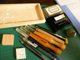 今日の記事は、MIKERINのはんこが出来上がるまで。です。 トリカステラさんのところで制作過程を読んで、私も一度記録のために書いておこうかな...と。 使う道具はこちら。このほか、大きい消しゴムを最初に切るのに古い包丁を使います。基本的にインクは黒のみ。手にとってくれた方が好きな色で沢山はんこを使っていただけるように、色のイメージをつけないために黒だけを使ってます。 ノートに下書きしたイラストをまずはトレーシングペーパーでトレース。 消しゴムは、私は前もって3センチ幅に切って粉を落としておきます。大体合う幅に切っておいた消しゴムに爪でこすって写します。 さ、彫りますよ~。彫ってるとこはこんな感じ。ゴミ箱代わりの箱を置き、刃を向こうにして手前から奥に彫る派です。右手の小指でしっかり消しゴムを支えてますよ~。椅子に座ってますが、たまに椅子の上でも正座したり、片膝を立てたり。けっこう行儀悪し。肘または手首をついて彫ってますが、気づくと顔が近づいていっちゃいます。15センチくらい?? さて、今日のは鳥の切手型はんこ。最初に周りをグルッと彫ります。だいたいいつも広そうなところから彫っていきます。たまにいきなり細かいところに手を出すことも...文字部分はギリギリに彫っておきます。大体周りを彫ったら細かいところへ。鳥さんを彫ります。文字の上下はギリギリに彫って、上下の線を揃える感じ。細かい部分の彫り具合、彫り残しが無いかなど、電灯で照らして確認します。文字は上下左右一方向ずつ刃を入れていって、一文字ずつではなく全てを一つのイラストと考えて一気に彫る感じで。(うーん、上手く言えない...) 文字も彫れたら彫刻刀の出番です。クローバーの中の線は三角刀で。内側の余分なところは丸刀で、綺麗に平らにならします。私の切手型はんこのお助け者。小さいサイズのこの丸刀。私の切手枠の周囲の丸い溝にぴったんこなのです。丸刀を使って一瞬で切手枠が彫り上がり、このはんこは完成。記録用に紙に捺して、持ち手にも一緒に捺しちゃいます。基本的に私は試し捺しをしません。一度紙に捺してもよほどの間違いがなければ彫り直しをしないので...毎回全部一発勝負なのです!ちょっとくらい変なところがあっても、”手作りの味”で割り切る。けっこう強気(汗)使い古したバーサマークのインクと練り消しを使って、出来る限り印面のお掃除。試し捺しをほとんどしないので、けっこう綺麗になります。持ち手の側面に自分印を捺します。乾くのを待って...持ち手にワックスを塗ります。蜜蝋入りの自然素材のワックスを愛用してます。奥に映っているのは、ワックスを塗っていないもの。けっこう色に変化がでるでしょう?持ち手とはんこをボンドで接着。多用途のクリアタイプのボンドを愛用。これで完成です!パチパチパチ... 今回は順に1個のはんこを作りましたが、いつもはいくつものはんこを一緒に作ります。一気に写して、一気に彫って、一気に捺して、一気に貼って...って感じ。 1個のはんこにかける彫り時間は5分から長くて1時間くらい。ちなみにこの鳥の切手型はんこは22分で彫り上がり。 最後にちょこっとおめかしした写真を撮ります。ブログの記録用。納品の記録用など。 いかがでしたでしょうか?今日の記事。ながーい記事にお付き合いくださいまして、ありがとうございました。 のんびりモードに切り替えて、引き続きランキングに参加中↓ 気が向いたら ポチッと、応援よろしくお願いします♪・.***MIKERIN作品集***.・◇消しゴムはんこのお部屋 ◇Mikerinchi-素材の部屋 タグ交換会9月9日〆切です♪私はなんとか完成です。
