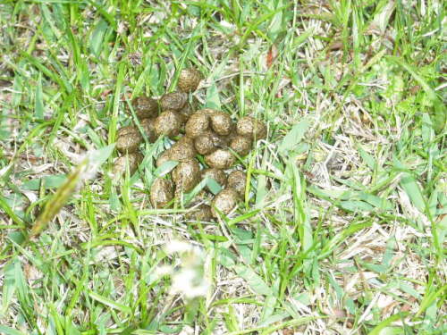 先週金曜日(4月27日)、いこいの村の草の中に見つけました。というか、教えてもらい気づきました。卵型(直径1~1.5センチほど)のかわいいフンの集合写真。少し前まで、野ウサギさんたちも、遠足をしていたのでしょうか?