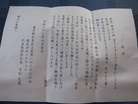 霊園・納骨堂・葬祭事業大手のニチリョク(7578、JQ)から、お中元として隠れ優待が到着しました。 「紀州 石神の梅干」です。早速開けてみます。 梅の自然な良い香りが広がります。一つ一つが大粒ですし、これはかなり高級な梅ですね。 ちょうど昨日届いたばかりのクロップスの優待きしめんを作ったので、その上に一粒乗せてみました。 きしめんの味が引き締まってとっても美味しかったです。 ニチリョクは現在の株価は195円、PBR0.68、株主持分比率37.1%、予想PER12.29、配当利回り3.9%で、表優待は1000株保有で「墓石工事代金10%割引など」なのですが、裏優待で年に2回品物が戴けます。 3月の裏優待品は例年上記の「紀州 石神の梅干」、9月の裏優待品は「博多の辛子明太子300グラム」のようです。この梅干し、買えば2000円はすると思うので、裏優待1回を2000円分と仮定すると、総合利回りは5.9%となります。 それにしても隠れ優待銘柄と言うのは本当に色々ありますよね。私もこれからも一つでも多くの隠れ優待に出会いたいと考えています。