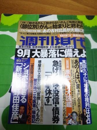 今週の週刊現代を本屋さんでふと見ると、 急げ!株・投信・債券「万事休す」 負債4000億円 安愚楽牧場 消えた「創業者一族」 「金投資」で確実に儲けている人たち などの我々投資家にとっては気になる見出しが並んでいたので、思わず買ってしまいました。 記事によると、「株も投信も債券も暴落する。今すぐ全て売り払って9月危機に備えよ!」 と言うことでしたが、週刊現代やポストにこの手の悲観一色の記事が出たときが相場の当面の底、ということが過去良くあり、私は一つの「逆指標」として以前から注目しています。 本当に9月危機はやってくるのか、来ないのか? 興味深いですね。