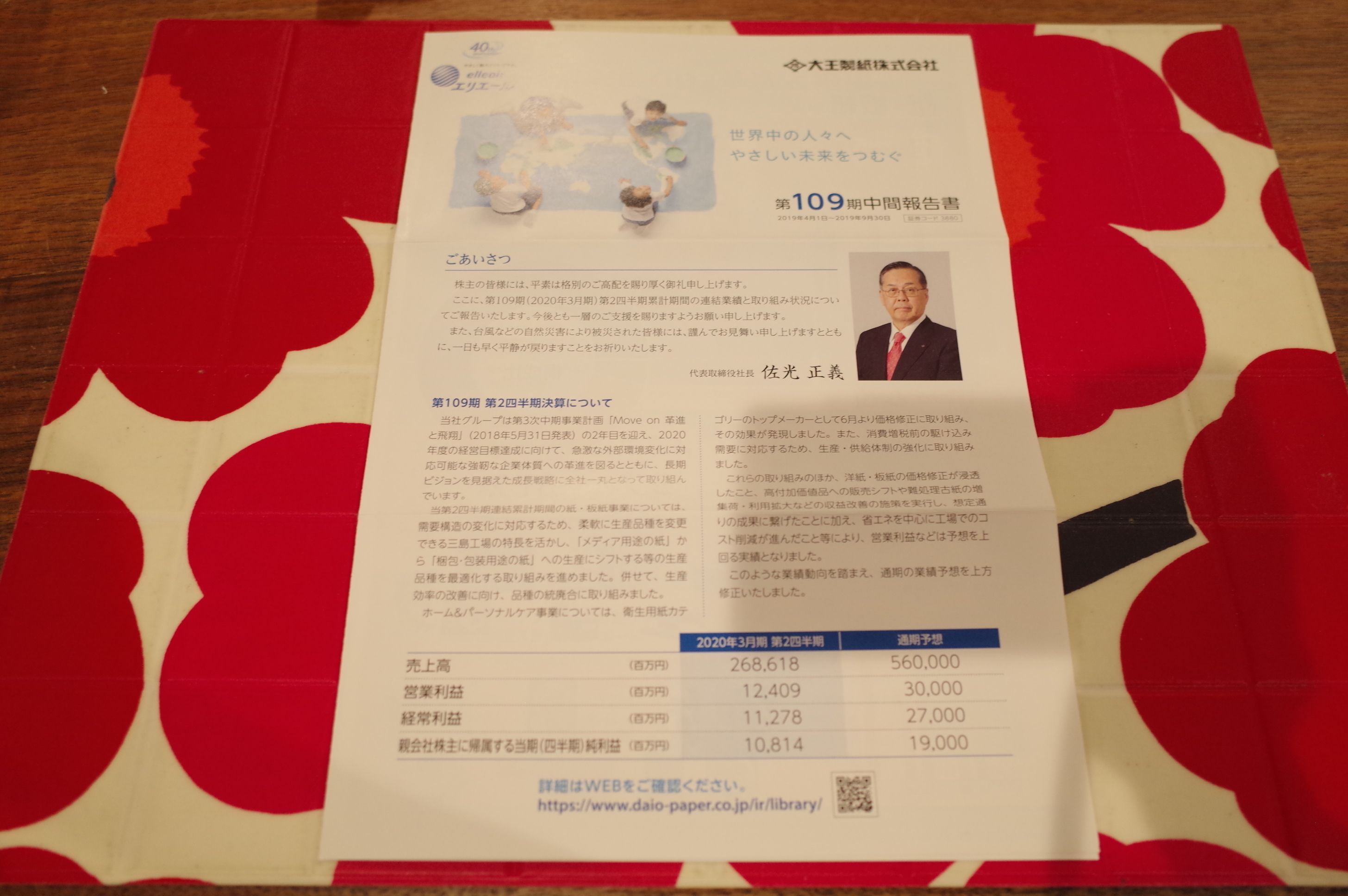 さて今日は2020PF概況シリーズです。441位 3880 大王製紙 (東1、3月優待) ○ PF441位は、業界4位で、『エリエール』ブランドで家庭紙では首位級の大王製紙です。 現在の株価は1712円、時価総額2893億円、PBR1.30、自己資本比率は25.3%、今期予想PER15.75、配当利回り0.9%(15.5円)、総合利回り1.5%(15.5+10=25.5円)で、優待は「1年以上の継続保有を条件として」100株保有で1000円相当の自社商品詰合せ(トイレットペーパー・ティッシュペーパー等)です。 今日は私が過去に頂いた100株優待品を数年分眺めておきましょう。いずれも、日々の生活にダイレクトに役立つ実践的で質実剛健な内容です。 大王製紙は、指標的な割高感もないですし、上記の通り優待内容にも力がありますし、ポートフォリオ中位としては特段の問題のない、良い銘柄であると評価しています。