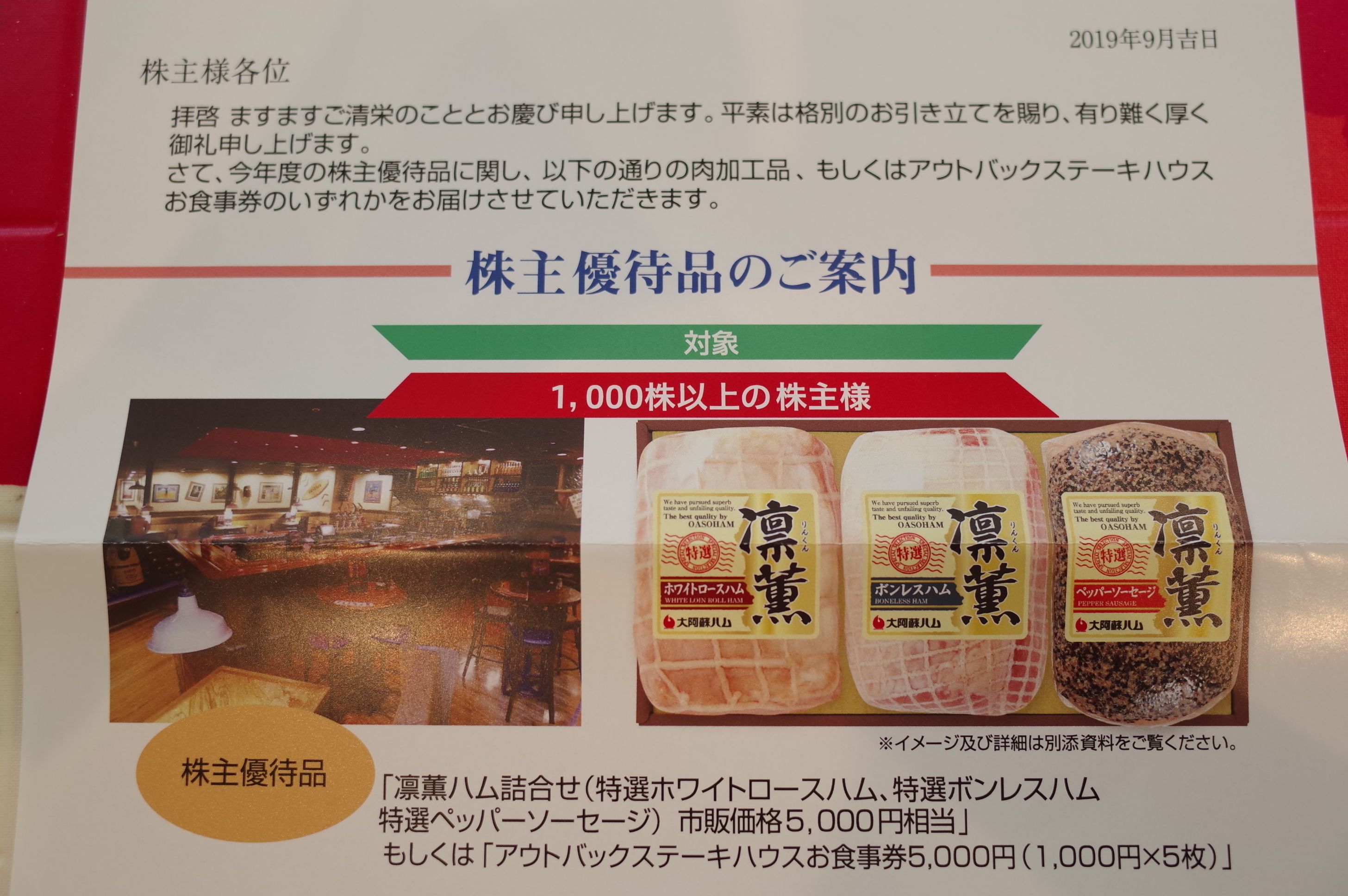 プラス年1回7月に、500株保有で3000円相当、1000株保有で5000円相当の自社取扱商品(ハム・ソーセージ)もしくはアウトバックステーキハウスで使える食事券です。