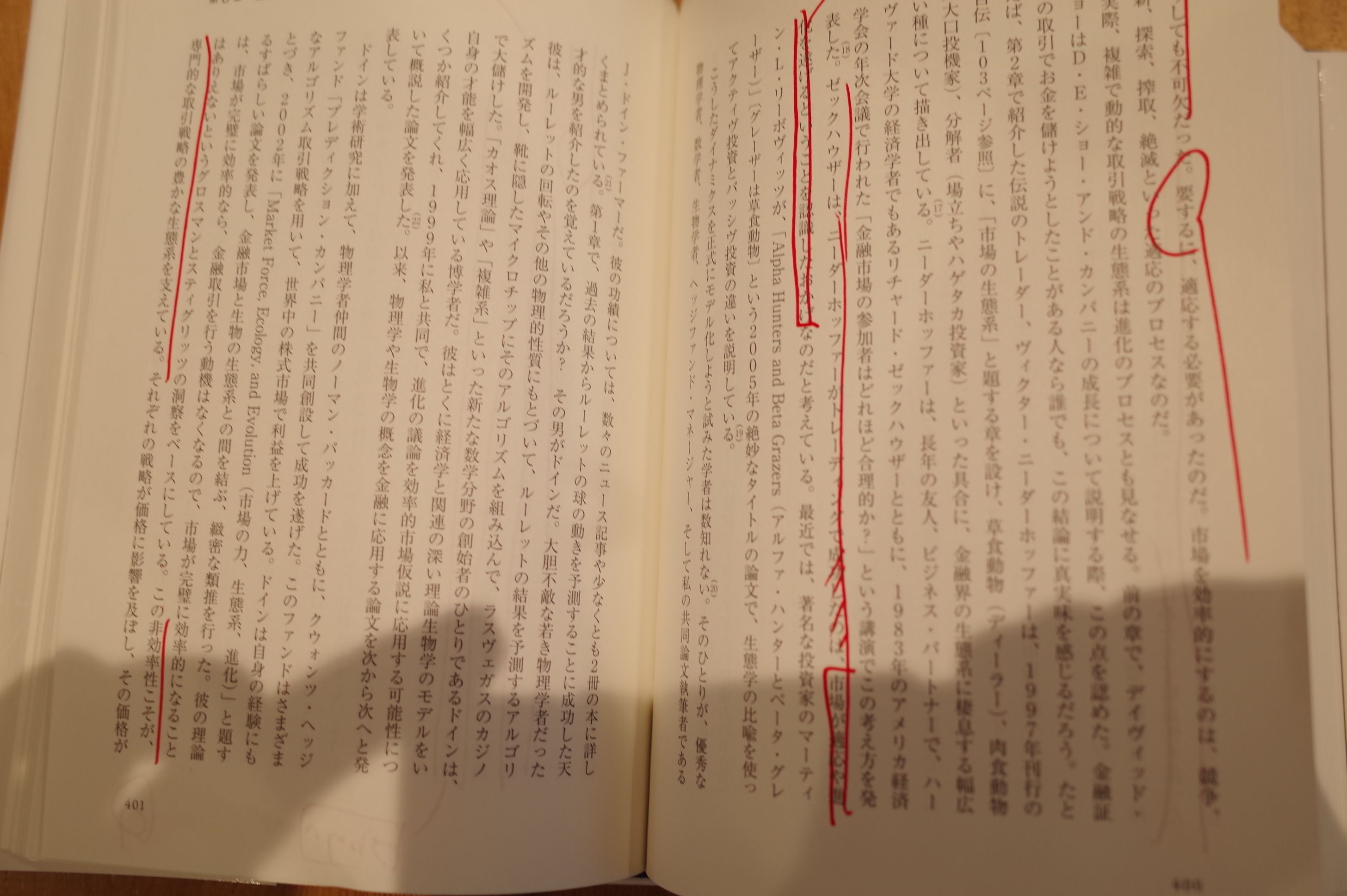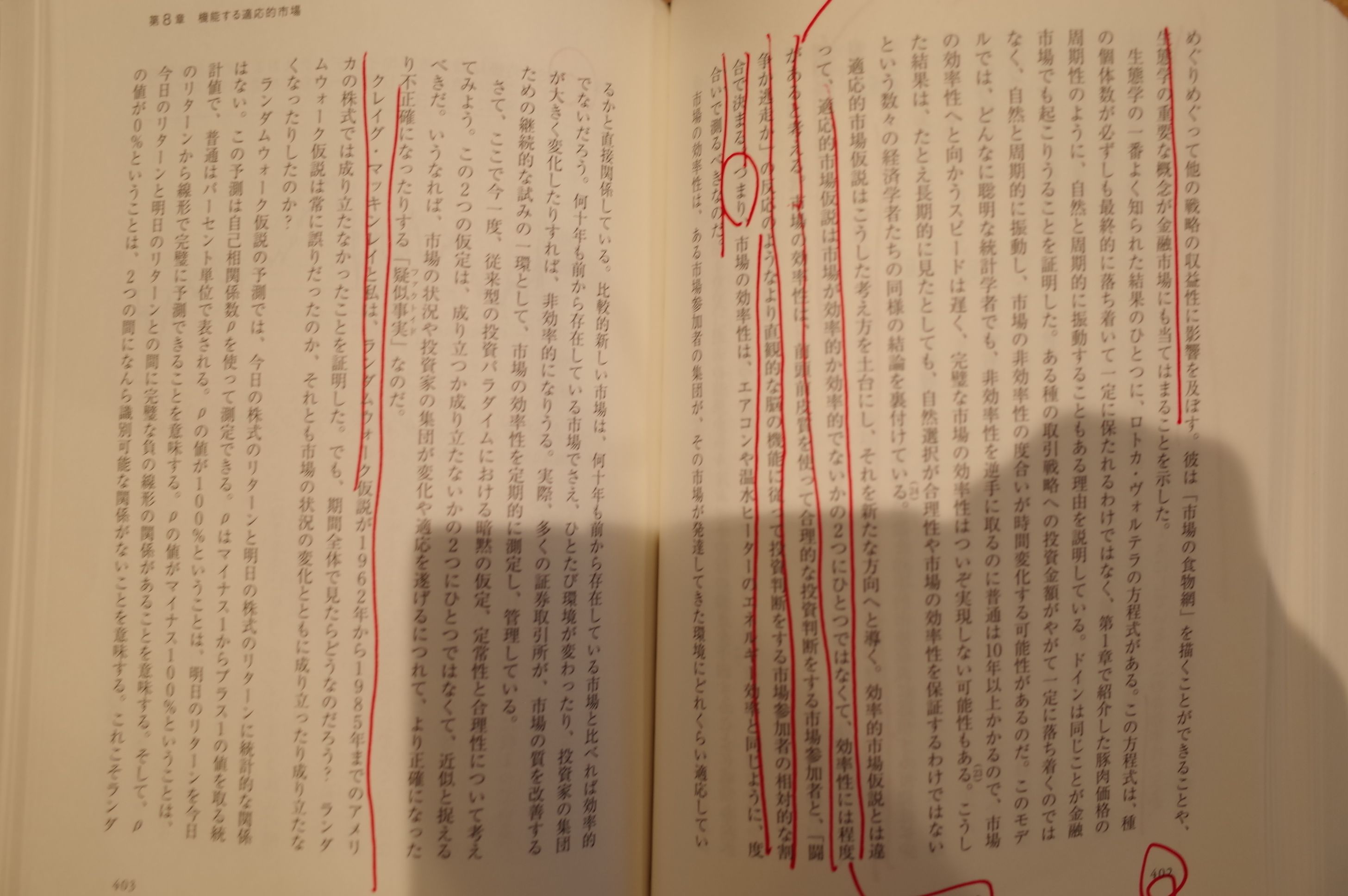 適応的市場仮説は市場が効率的か効率的でないかの2つにひとつではなくて、効率性には程度があると考える。市場の効率性は、前頭前皮質を使って合理的な投資判断をする市場参加者と、「闘争か逃走か」の反応のようなより直感的な脳の機能に従って投資判断をする市場参加者の相対的な割合で決まる。つまり、 市場の効率性は、エアコンや温水ヒーターのエネルギー効率と同じように、度合いで測るべき なのだ。