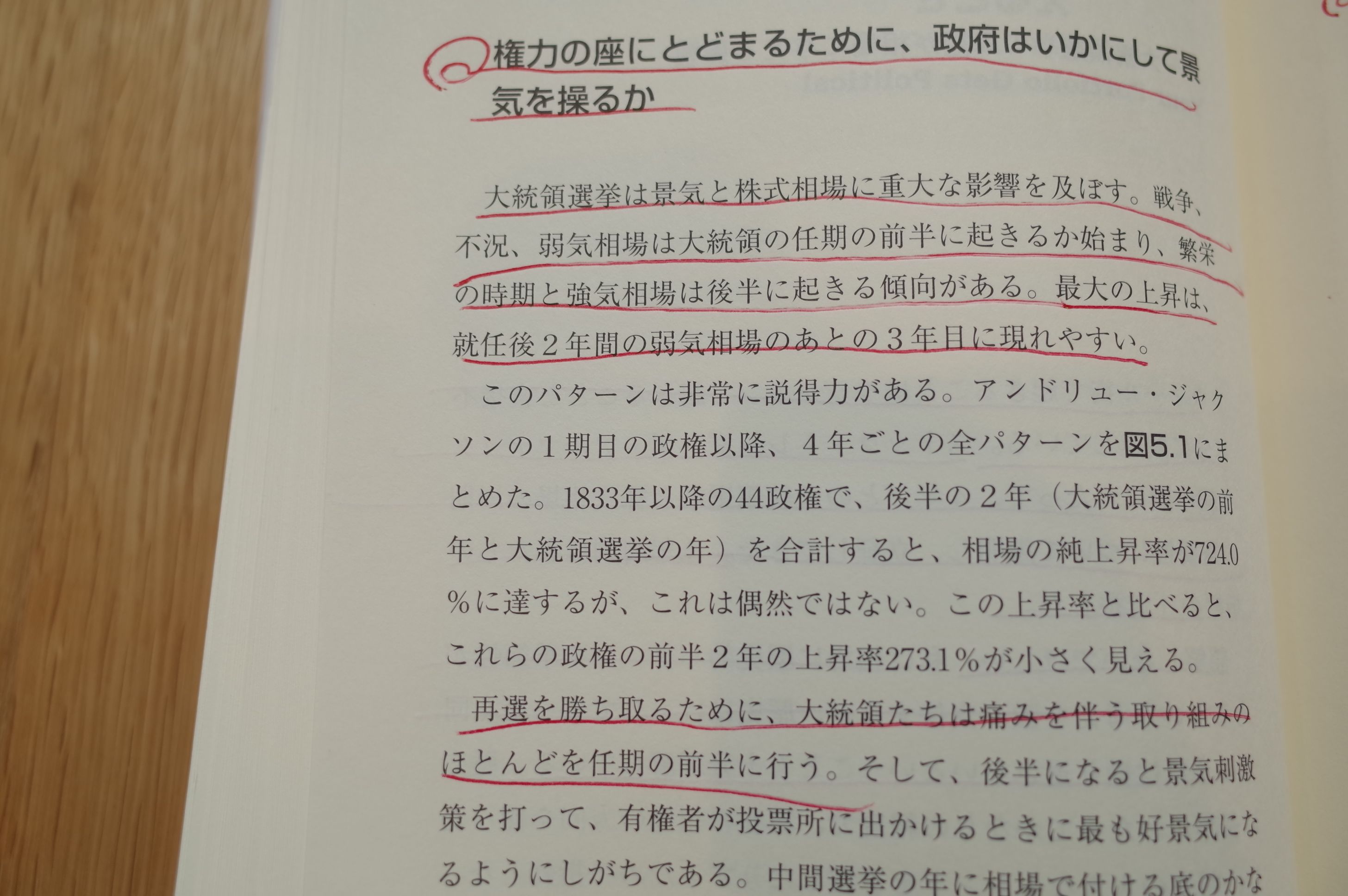 大統領選挙は景気と株式市場に重大な影響を及ぼす。戦争、不況、弱気相場は大統領の任期の前半に起きるか始まり、繁栄の時期と強気相場は後半に起きる傾向がある。最大の上昇は、就任後2年間の弱気相場のあとの3年目に現れやすい。