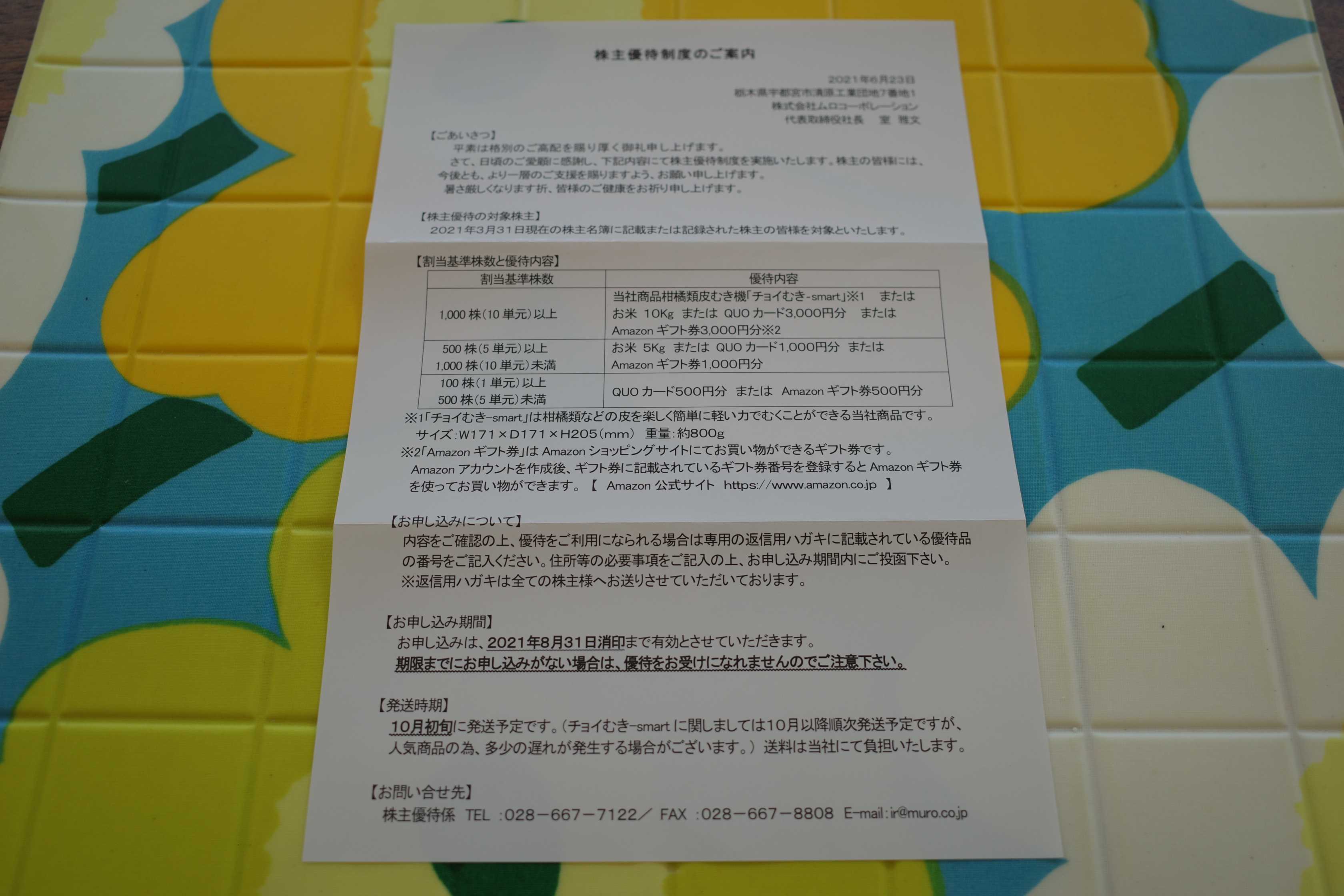 2021年1月21日に優待変更のアナウンスがあり、選択できる金券がクオカード1択からクオカードもしくはアマゾンギフト券の2択からの選択制となりました。