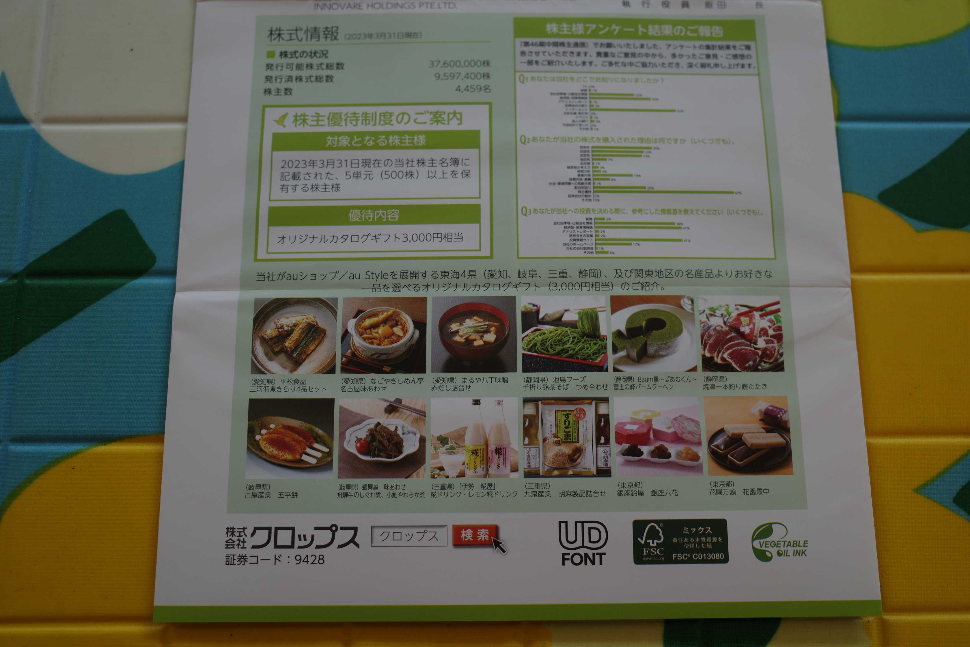 現在の株価は1029円、時価総額99億円、PBR0.92、自己資本比率は33.7%、今期予想PER9.54、配当利回り1.9%(20円)、総合利回り2.5%(20+6=26円)で、優待は500株保有で3000円相当のオリジナルカタログギフトです。