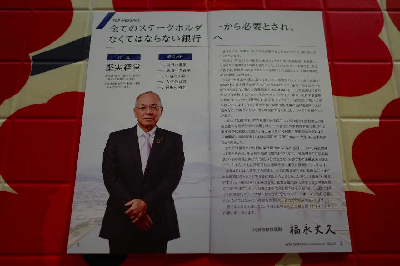 現在の株価は3605円、時価総額1442億円、PBR0.43、自己資本比率は8.4%(国内10.82%)、今期予想PER10.06、配当利回り2.8%(100円)、総合利回り3.2%(100+15=115円、利回りは200株保有時で換算)で、優待は100株保有で徳島県特産藍製品、200株保有で3000円相当の地元特産品、1000株保有で6000円相当の地元特産品です。