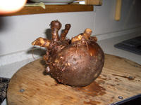こんにゃくも自然のままで作っています。こんにゃくがこのぐらいの大きさになるには3年ぐらいかかります。他の作物と違って、できるまで日数がかかります。