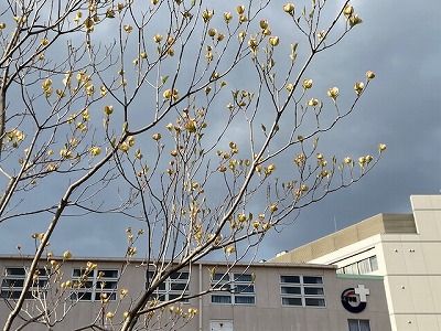 学校にハナミズキの花が咲きました。何でもアメリカの学校と交流したときにもらった木だとか?