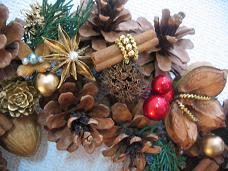 今日のトロッケンゲビンデのレッスンは、30cmのクリスマスクランツ(リース)でした。実家でせっせとワイヤリングしたもの(松かさ、アンバー、胡桃、カラマツ、ノグルミ、タイワンフウ、モゾウの実)に加えて、八角、ブナ、ツバキ、シナモン、マウンテンジェニファーをワイヤリングしました。たくさんの種類の木の実を使っています。ブナ、金色にスプレーした八角にはワイヤーにビーズを通して付けました。またツバキは金色のボイロンを巻き、シナモンには金のビーズとボイロンを巻きました。これだけで、茶色の木の実がすごく華やかになります。松かさのクランツのときは、外側の松が開きすぎて失敗したので、今回はこれでもかというくらいかみ合わせて編んでいきました。なので、開いているということはないかな?ちょっと形が変になってしまいましたが・・・ なかなかシックにできました♪早速家に飾ったら、一気にクリスマスムードになりました。来月は松かさでクリスマスツリーを作ります。前回のろうそく立てもあるし、今年のクリスマスは華やかになりそうです。あとはクリスマスツリーに飾るもの(木の実を加工したり、羊毛ボールのリースとか・・・)作りたいのですが、なかなか時間がありません。。。(これまでのトロッケンゲビンデの作品はこちら)- - - - - - - - - - - - - - - - - - - - - - - - - - - - - - - - - - - - - - - - - - - - - - イベントのお知らせです。 名古屋栄三越 6階イベントスペース 12月5日(火)から11日(月)まで 10:00~19:00 〔8日(金)~11日(月)は20:00まで〕 トロッケンゲビンデの先生のクリスマス作品展示即売会があります。見に行くだけでもいいので、栄方面に行かれた方は是非のぞいてみてください。私は6日に行く予定です。9日から11日は体験レッスンもあって、このリースのリボンと似た材料で、クリスマスのアンヘンクゼルを作ります。興味のある方はおっしゃってくださいね。- - - - - - - - - - - - - - - - - - - - - - - - - - - - - - - - - - - - - - - - - - - - - -クリスマスリースいろいろ 一番右のようなリースを、羊毛フェルトで作りたいなぁと思っています。 (できるかどうかは未定。。)