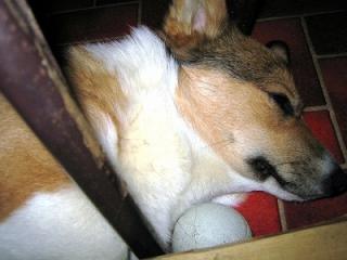ミックんの強敵現る!愛慕です。ムラが有って80%はミックん単独ですが愛慕がミックんが追っかけているボールを察知すると、スタート出遅れるが長いコンパス利用して(走ったら超スピード)ミックンに追いつきます。そしてボールを横取りに行きます。ミックん目をむいて取られまいと頑張る。勝敗は??