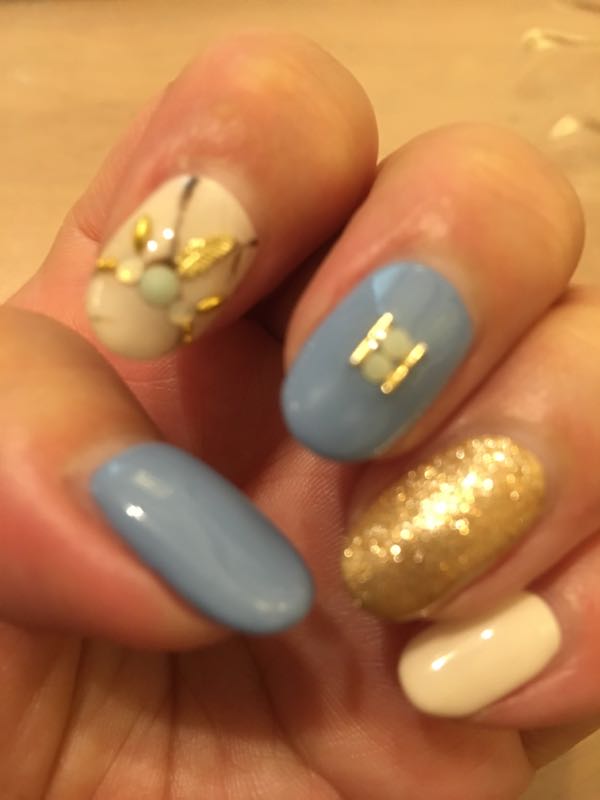 ブレまくってて 酷い写りですが、なんとか見えますか? 段々気が大きくなって、普段なら選ばない様な色を選びました でも今回服にしろ靴にしろ青が中心だったので、丁度良いと思いましたが、お出かけはジーンズばかりで合わせて無い 今回の金属というか飾りは、ちょっと大きくてギリギリに乗せてました 出来上がりにいつも、引っかかる所無いですか?って聞かれて爪先を一通り確認してOKしたのですが 途中ブックオフに寄り道して立ち読みして帰り、着いた途端 あー疲れたと顔に手をやったら痛みが 金属の飾りがしっかりコーティングされて無くて顔をひっかいちゃいました すぐに電話したけど空いて無くて、翌日朝一にお直しして貰いました 今度からもっと入念に確認しなくちゃね 次は8月の末にして貰う様に予約してあるんだけど、1本もう取れちゃってカッコ悪