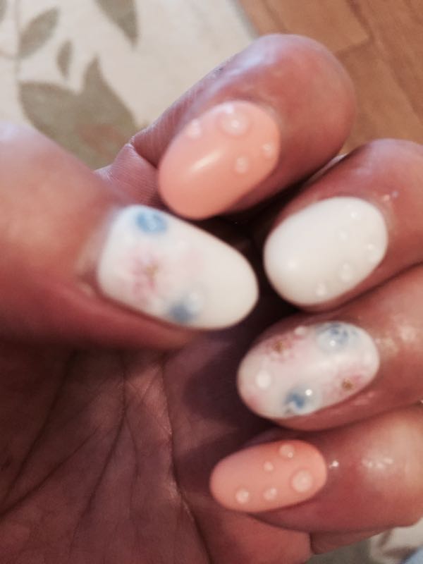 随分ご無沙汰してしまいました! これは、6月分のです 色は普通の白とサーモンピンクですが、表面をマットに仕上げてあります そして、プクプクした水滴に見えるように付いてます 白の上には水色にピンク まるで紫陽花みたいでかわいいです