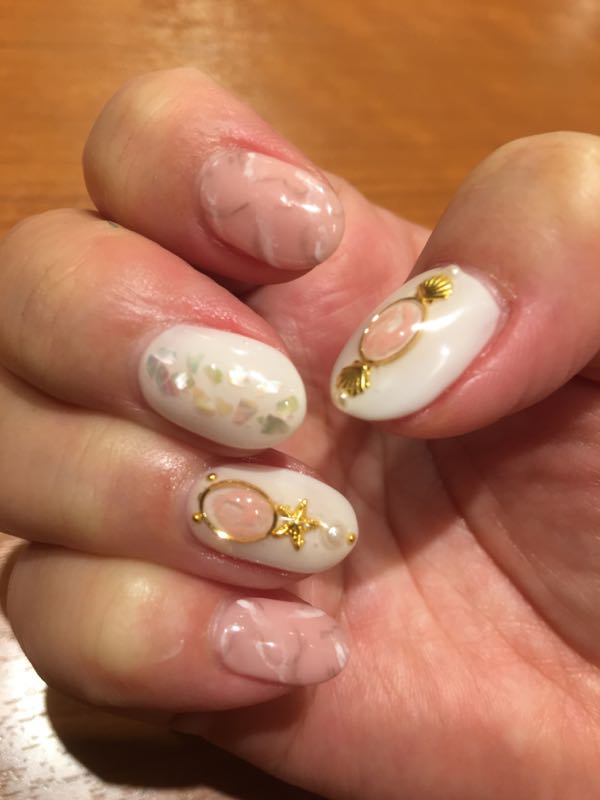 今頃?って声が聞こえる、、 すっかり忘れてました 5月の終わりにしたネイルアートです 久しぶりに一番高いランクのネイルアートにしました まあ、単純に他のネイルアートやりたいのが無かったのです まあ贅沢なネイルです 真ん中の指は貝殻が乗り、二本はピンクと白と黒のマーブルです 親指と薬指の上に乗ってるピンクの物は 何時もだとプラスチックなのですが、今回のは、金属の輪っかの中にジェルを入れて高さを作り表面にピンクを塗ってます その他にも金具をたくさん乗せてるので、爪が伸びた時どうしようかと迷いました 次がすぐに来れそうに無いので、自分で切るしかないのですが、悩んでも仕方ないって放り投げちゃった