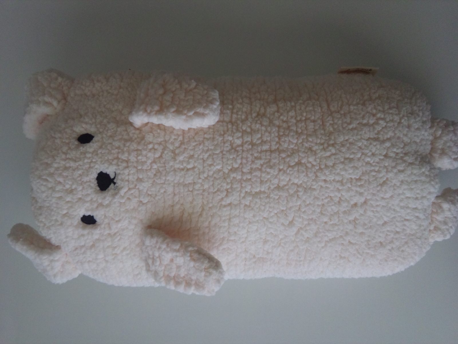急に寒くなって。とうとう。これが。活躍する時が。やってきました。 見た目は。可愛いぬいぐるみ。そう。確かに。ふわふわしていて。滅茶苦茶、可愛いのですが。実は、これ。背中に秘密があるのです。 背中のポケットに入っているのは。電子レンジであっためて使う。湯たんぽ。そうなのです。これ。湯たんぽ入りの抱き枕。寝る時に使うのは、もちろん。座っている時に。お腹の上に乗せておけば。ホカホカで。あったかいんですよ。節電の冬。こういう。「あったかわいい」ものだと。楽しいかも…ですね。