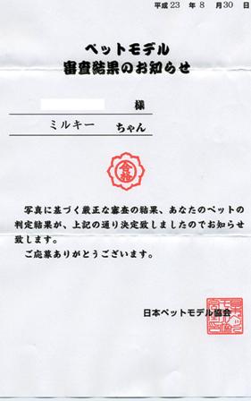 先日、写真撮影してもらったモデル協会からお手紙こんなの・・・・入ってましたミルキーもトレジャーも日本ペットモデル協会の審査に合格したらしいですホント多分・・・全員合格だろうなま、そうだとしても、親バカとしては大喜びで~す 説明会があるけど残念ながら、その日は先約あり出席しないとダメ と電話してみると資料送ってくれるらしい頑張れ ミルトレ