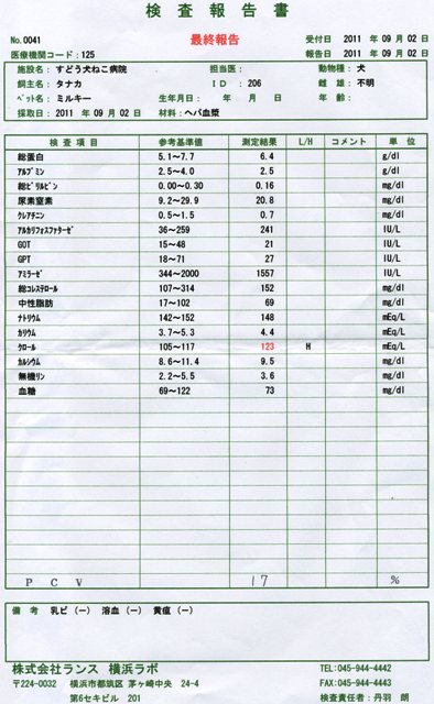 なかなか寝付けなかった乳母に、トレジャーはずっと寄り添っていてくれた。朝の電話が待ち遠しい10時ちょっと前に電話がなった血液検査の結果、数値が「22」まで上がったので骨髄検査をする方向で準備しますが、昨夜から、ちょっと下痢気味で、ウンチに血が混ざってました人間でも輸血をすると下痢気味になるよと圭一郎が教えてくれたのでそれは問題なさそうだが、血便は3日間、須藤先生のところに入院して、一日おいて、大学病院に入院だからストレスか様子見ながら、検査をするので、午後5時位に来て下さい 5時って言われても、ちょっとでも早くミルキーに会いたくてトレジャーと30分も前に病院に到着時間になって、診察室に案内されるも、昨日と一緒でミルキーはいない資料だけが、いっぱいミルキーは 帰れないの教授の説明骨髄検査の結果、骨髄には赤血球がありましたできたばかりのものも、できあがったものも歪な形をした細胞はないので、治療の結果、赤血球が作られ始めたと考えましょう・・・白血病の疑いもないしステロイドをしばらく飲むことになるけれど、様子を見ていきましょうって。思い切って聞いちゃいました「今の時点で、余命宣告とかないですよね」「それはありませんよ」昨日、あんなに落ち込んでいたのにこれから様子見で、すべてがになったわけではないけどまだ、ミルキーはそばにいてくれるらしいよかったご心配下さった方、一緒に泣いて下さった方ありがとうございましたまだまだ、これからもよろしくお願いします 麻酔から覚めたばかりなのに、車の中では吠え続け帰宅してからも、駐車場から家までの数十メートルだけど、軽やかに歩きましたご飯食べるにも久しぶりの反応生肉と茹で野菜を、器から食べ食べ終わるとグリニースの催促いつものミルキーに戻ってます(これは、輸血のおかげなので、自力で赤血球をどこまで作って元通りになるには、どれくらいかかるのでしょう)来週また、大学病院で診察ですがゆっくりでもいいので、しっかり、元気を取り戻してくれるよう、祈ってます