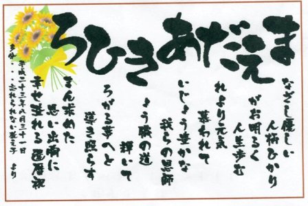 中学3年生のときの担任が8月31日 60歳の誕生日を迎えたで、今日が還暦祝いパーティー実は、この計画・・・・・2年前から始まっていて先生が60歳になるのは知っているが、誕生日を知らない寸前に聞くと、還暦祝いなんて疑われると困るので2年前に先生の誕生日を確認しお祝いの日を一番近い日ってことで9月3日に決定半年位前から、「先生、飲みに行きましょう」とお誘いそれも、先生と圭一郎と先生の3人だけで ってことで。もちろん、3人な訳はないのだけど先生にはそう信じ込ませる場所は、同級生のお店 「平八」お寿司屋さん貸し切りをお願いして、席数に合わせた人数に集合をかけるメンバー選びは、圭一郎と私の独断と偏見で選んだメンバーでメールで案内をし、「他言無用」の条件付みんな快く、出席の返事をくれて、集まったのが27名+お寿司屋さんの大将(同級生だもんね)計画の途中で、もう一人の恩師にも事情を説明したら喜んで、サプライズ参加を承諾何度も、先生(前田先生)からは「何人集まるんだ」と聞かれそのたびに「3人でって話したでしょ」と騙しとおす開始時間の前に全員お店にスタンバイもう一人の恩師(稲葉先生)は、先にお迎えに行き、みんなと一緒にお店でクラッカー持って待っててもらう。前田先生のお迎えに行き、お店到着の500m位前で「もうすぐ着きます~~」の電話そのときも、前田先生は「何人集まるんだ」「だから さ・ん・に・ん」お店のドアをガラガラ パンパン パ~ンクラッカーでお出迎え先生、還暦おめでとう記念品は額に入った「祝いうた」まなざし優しい人柄ひかりえがお明るく人生歩むだれより元気 慕われてあいじょう豊かな我らの恩師きょう職の道輝いてひろがる夢へ導き照らすろまん求めた思い出胸に幸せ溢れる還暦祝い ちょっと誉めすぎたかなそれから似顔絵入りグラス 稲葉先生は、前田先生へのサプライズを仕掛けたつもりだったけどホントは、一緒に騙されていて・・・・稲葉先生の古稀のお祝いもしちゃったのだから、紫のちゃんちゃんこと、赤のちゃんちゃんこ照れながらも、結構ご満悦なお二人最後まで、この格好でしたちなみにこの格好で、車に乗り、ご自宅に帰ったお二人は家族から「どうしたの」と言われたらしい同窓会と違って、少人数だと、幹事でも飲んで食べる暇がある和気あいあいと盛り上がるたのし~~~結局、帰宅は3時半今度は、どんな名目考えて、飲み会するんだろう楽しみだわ それにしても台風で暴風雨でも決行と前日みんなにメールをしたけど一番大変だったのが私なんて言っても、東名高速 清水~富士間が高波により通行止めみんなから「来れるのか~」と心配のメールが届くが言いだしっぺが行かないわけにはいかない金曜日の仕事を終えてから、中央高速で愛知へ向かう東名で行くより100km遠いそれも雨で、スピード規制 視界は悪いしトラック多い 東名よりカーブも多いから走りにくい途中、ちょっと仮眠したから、実家到着午前4時そのあとテレビ見ると中央高速も通行止めになっていた。タッチの差よかった~~~風は強いけど、ほとんど雨に降られることもなく無事に還暦祝いパーティーは終了やっぱり、私は晴れ女