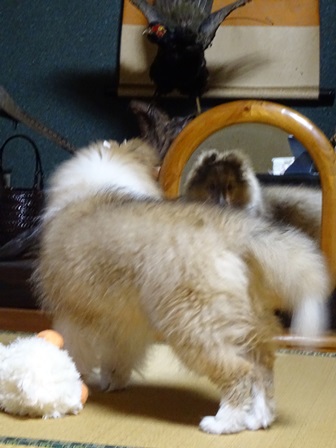 あいにくの雨午後からかと思っていたのに、朝からず~~と一日中だったつまらないよね~~家の中で走り回っているレナートが時々、消えるどこに行ったのかと思ったらレナートサイズの鏡を見つけたらしいしばらく、見つめあった後鏡の後ろを除いたりワンワンって吠えたり・・・・鏡の中に、もう一人のレナートがいる気分らしい後ろで、そぉ~~と見ていたけどカメラを向けると「何 何撮っているの」と乳母に近づいてきてまるで何もなかったように振る舞っているひとり、こっそり楽しみたいらしい雨の日のレナートの遊び方動画撮影に成功したいなぁ~~ にほんブログ村