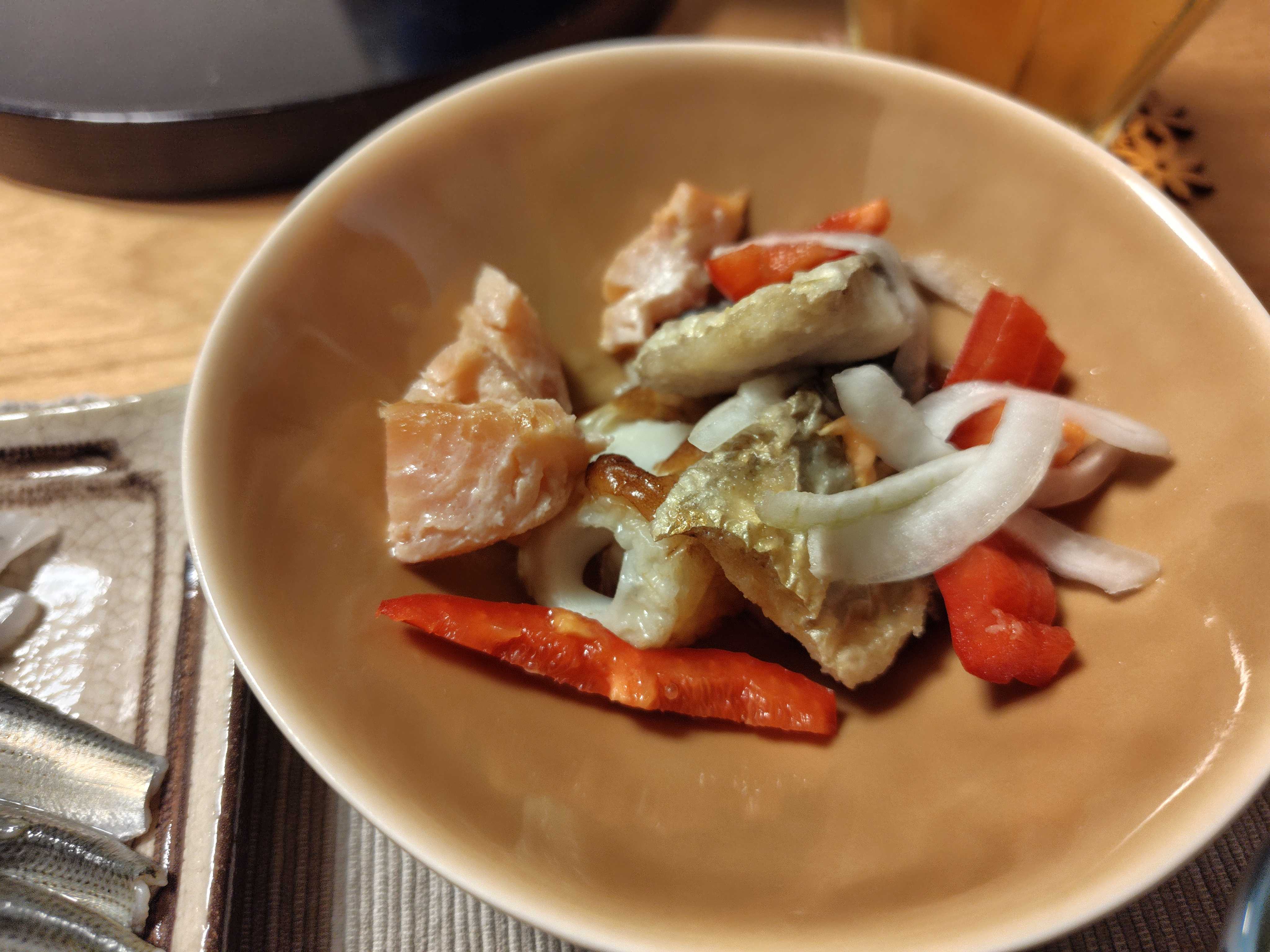 穴子の唐揚げです。塩と山椒で頂きます。ふるさと納税で昨晩うなぎが来る予定だったけど、勘違いで今晩だ。頭がうなぎになっていたので、穴子にしたんだ。似てるから頭が勘違いするかな。山椒が効いて美味い。こちらも残り物の生クリーム。おっ、鯛があるぞ。鯛のグリルの生クリームソースでいこう。ソースがシャバシャバだけど美味い。上はカリフラワーにチーズを乗せてバーナーで炙りました。シャバシャバソースが美味い。〆はパスタ。前回使い方が分からなかったドライトマトのオイル漬け。オイルをタップリ使いスモークサーモンと合わせてみたぞ。独特のドライトマト香りがとっても美味い。今度はピザに乗せてみよう。