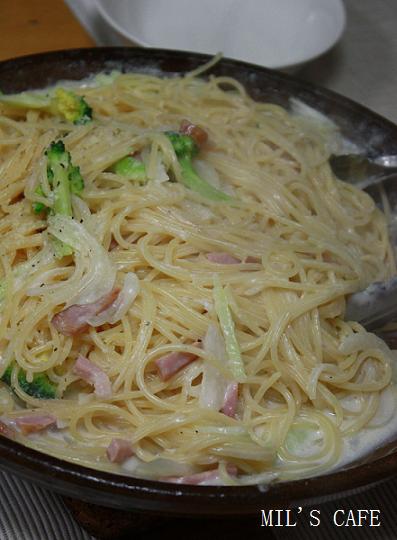 連休で困るのは、お昼ご飯。帰省から帰って2連続で外食してしまいましたので、連休は質素に過ごしてます…。今日は、500g148円の1.6mmのパスタを使ってお昼ご飯作りました。私も胃が悪いわけではないので食べちゃうし…食欲がないわけでないので、どうしたらよいやら。でもなんかすっきりしません。昼寝でもしようかと思いながら、今から寝たら、また夕飯の時間になるね…。ほんと肉体的にも精神的にも健康って大事ですね。アイロンがけもすんだし、夕飯の時間までゆっくりしようかな…。まず、陶板(ソース用)と大きなお鍋(パスタ茹で用)を用意。お湯を沸かしながら・・・玉ねぎをスライス。ベーコンを細切り。ブロッコリーを一口大に切る。ブロッコリーをさっと茹で水につけ色止めしておく。陶板にオリーブオイルを注ぎ、ベーコン玉ねぎを炒める。塩胡椒、にんにくをする。水、牛乳を注ぎ、コンソメ、シチューのルー、パルメザンチーズを入れる。弱火にして煮詰めていく(牛乳で濃度調節)。パスタを茹でる(塩を入れ、固めに茹でる)。ブロッコリーとパスタを陶板の中に入れ、ソースにからめていく。まんべんなく混ぜ、パメザンチーズ、塩胡椒したらできあがり。陶板でなくても、フライパンでOKです。陶板だと、そのまま食卓にだせて、保温力もあるので助かります。 ブログランキング参加中です! 毎日1回3個のバナーをポチっとクリックして頂くとランキングがアップします。 design by ともまお☆