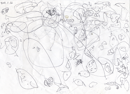 「おえかき」で「えのぐ」や「ぺん」で「おめめ」「おくち」「まゆげ」を描くようになった。