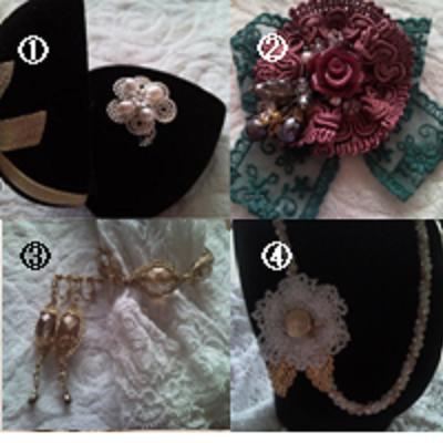 昨日ヤフーのブログがいきなり消え去ってしまっていて、がっくりしていました。本当は楽天ブログはビーズの講習会とかはバックアップ用に載せていた感じだったので・・・でもこのブログが生きていてよかった。数年前立ち上げてから、暫く仕事で忙しくログインすらしていませんでしたが、ビーズ講師をはじめて又戻ってきたら、このブログ生きているし、それが励みでした。たったそんなことが、講師大変でも続けようと力になってくれたわけです。そして、今日も。調べてて分かったのですが、ヤフーブログもグーグルブログも勝手に消されてしまうことがあったようです。利用違反があると消されるみたいですが、消す前に一言通告してほしいものです。利用違反していなくても消された方たちもいました。私も掲示板みたいに、レッスンの日を案内していただけですが・・・ブログ上で売買してはいないんですけどね~?そういうわけで他にも悲しんでいらっしゃる方々がすでにいたようです。気をとりなおして、「名古屋栄三越店 即売会のおしらせ」です。2009年12月23日~29日名古屋栄三越7Fで「コスチュームジュエリー展」がおこなわれます。同フロアでクチュールフローラの作品で即売会参加します。いえ、私はいません。私の作品がでます。横浜の話ばっかりしていたのに、ばぜ名古屋?って、たまたまです。たまたまそんな話をいただけたことを、心から感謝しています。ジュエリー展は大人700円ですが、即売会は無料で見て回れると思います。なので、お近くの方はみてみてください。写真以外にも他多数出品しました。
