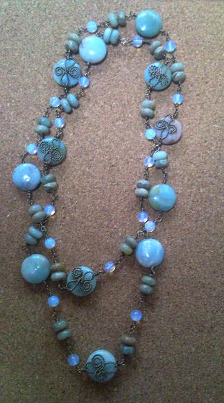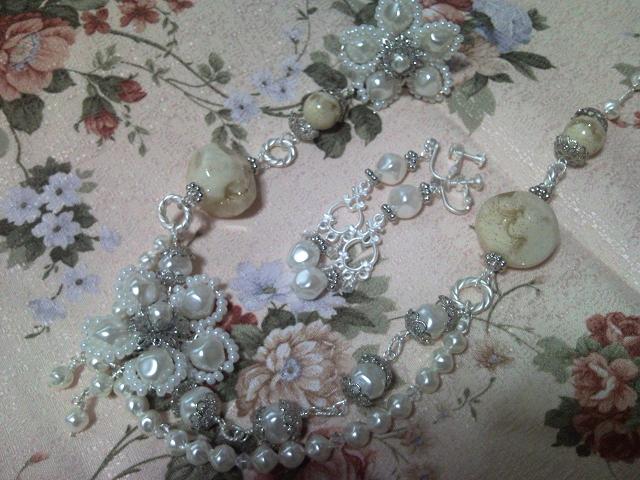 お知らせ☆パーツクラブ川崎店で約3年~4年?ほどですが、ワイヤーのレッスンをさせていただいておりましたが、このたび、講師の私が入籍をした事により、引越しの理由で、距離的に遠くなり、皆様には長々ご愛好いただいておりましたが、5月までとさせていただきましたことをお知らせいたします。5月のレッスンで川崎パーツクラブのワイヤーレッスンは最後となるわけですが、ワイヤーの講師としては今後も活動していきますので、よろしくお願いします~今年春の大桟橋のビースショー(2012年5月18日(金)~20日(日) 10:00~18:00)にワイヤーガールズのブースがBブース81番にございます。ありがたくも、私のキットをおかせていただけることとなり、以前パーツクラブ川崎店でレッスンをした作品(画像↓)をキット化して出す事にしました。ホワイトネックレス4700円です。ワイヤーモード講座の内容が4月から新しくリニューアルいたしました☆詳しくはまた後日…5月25日には藤棚地区センターのお祭りに、スイーツデコで、でます~おたのしみに~
