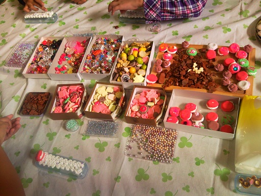 西地区センター祭を去る2011年11月12日と13日に開催されビーズ・スイーツデコで出たんですよ~朝から大盛況で、お子さんを中心に、大人の方も参加され大盛況でした。男の子も女の子もスイーツ大人気でした!下の写真は2日目の様子です。パフェストラップ1子200円ペンケース1個500円クリームを持って差し上げますので、皆さん自由に出ているパーツをなんと盛り放題!山ほどマカロンを作っていったのですが1日でなくなってしまい、帰ってから急いで作って生乾きのまま2日目追加する事態となりました。子供たちの作品の素晴らしいこと!年齢が低くなればなるほど何故か思いつかなさそうなすごい発想にあふれ、素晴らしい作品を作っています。今回はおそらく100名くらい対応したかと思います。かなりの大人数で席が常に空かない状態で、挙句の果てにはみんな立って作ってました。私のこの盛り放題ビーズ・スイーツデコは今回で開催5回目です。団体で予約くだされば、出張開催します!幼稚園~小学生対象(幼稚園児は保護者の方ご一緒にお願いします。)詳しくは↓にメールでお申し込みください。costumejewelry2006-toiawase@yahoo.co.jp