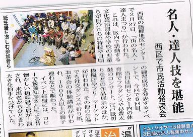 名人・達人まつりを2月27日(土)に無事終了しました。このイベントがなんか自分の中で山で、一気に力が抜けて、3月の活動はビーズの個人出張レッスンとパーツクラブのみで、のんびりとこのごろは過ごしています。名人・達人まつりは、その後いろいろなローカルメディアに取り上げられ、ここにタウンニュースに載った記事(タウンニュースさんに電話でブログに載せることを許可)を載せます。何故って、やっぱり、パソコンって実態つかみにくいですよね。本当にこの人存在していて、ちゃんと活動しているのだろうか?と私なら思うので。しかし、登録団体ビーズアクセサリーとはいえ、お祭りではスイーツデコをやっていました。うーむ、その破片の一文字たりとも記載されていないのは残念ですが、当日の写真も載せます♪人物がやっぱりネット上わかるといけないと思うので、見にくい写真になっています。でも、まじめに活動しているんだよ、ということを伝えるために、載せています。当日は雨の中1000人以上(私の個人的体感は500人~700人くらい)の方がお越しくださったようで、しかも毎年楽しみにされているとのことで、感謝です。私は初参加団体でしたが、今年は、スペースぎゅうぎゅうで、尽きることなく体験講座をしに、大人の方からお子様まで多くの方が楽しんでおられたようでうれしく思いました。来年はクオリティーをモット高くして、又参加しようと思っています。ところで、このお祭りは、本来は自分たちの発表はもちろん、あなたの街にはこんな人たちがいるんですよ、という紹介でもあり、自由に団体さんに希望があれば参加されたり、活動したりすることが、可能です。また、多くのいろいろなジャンルの先生方がまつりに名・達として出ています。そんな先生方に、お友達同士や知人が集まって、好きなものを習うことが出来るのです。基本的に、ボランティア精神で街のコミュニティの為に活躍されている方たちです。注意 ボランティア=ただ ではありません。あなたの街にも、街のためにがんばっている方たちがいらっしゃると思いますよ。仲間になり活躍されたい方や、先生を探している方、横浜市西区 活動支援センター に連絡してみてください☆