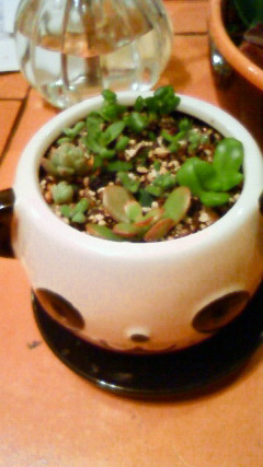 こんばんはまたまた、再登場でーすやっぱり、気が治まらなかった。どうしても赤ちゃん達をちゃんと植えたくて、こんな時間にせっせと作ってしまいました(正確には一時間前には完成してましたが(^^;))会社用です。 結局、これを含めて今日?(昨日?)は5個作りました パンダさんは会社用ですが、かなり小さいので少し落ち着いたらもって行く予定です残りの2個は不恰好なやつばかりを集めた、親苗なので、また今後の赤ちゃん待ちです。しかし、多肉さん達は何度見ても飽きないですよねtemplate:まりもん×photgraph:Vacant lot?