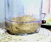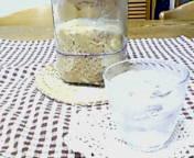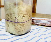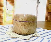 冷蔵庫の中でスタンバイ中のレーズン酵母ムクムクと大きくなっています。↓捏ねる直前の酵母です。ビンを開ける時にパン!!と押し上げられ酵母の元気な力を感じました。まずは、カンパーニュにチャレンジしてみます。