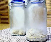 元種を3~4日に一度リフレッシュ♪リフレッシュ中の24時間は冷蔵庫に待機。この時は「ぱん焼き」ができないので元種を増やすことにしました。手前が昨日リフレッシュしたもの後ろの元種はさっき使ったのでこんな少し・・・・・。リスドォルを取寄せてるので早くリフレッシュさせなくちゃ冷蔵庫は酵母関係のビンが占領してます。