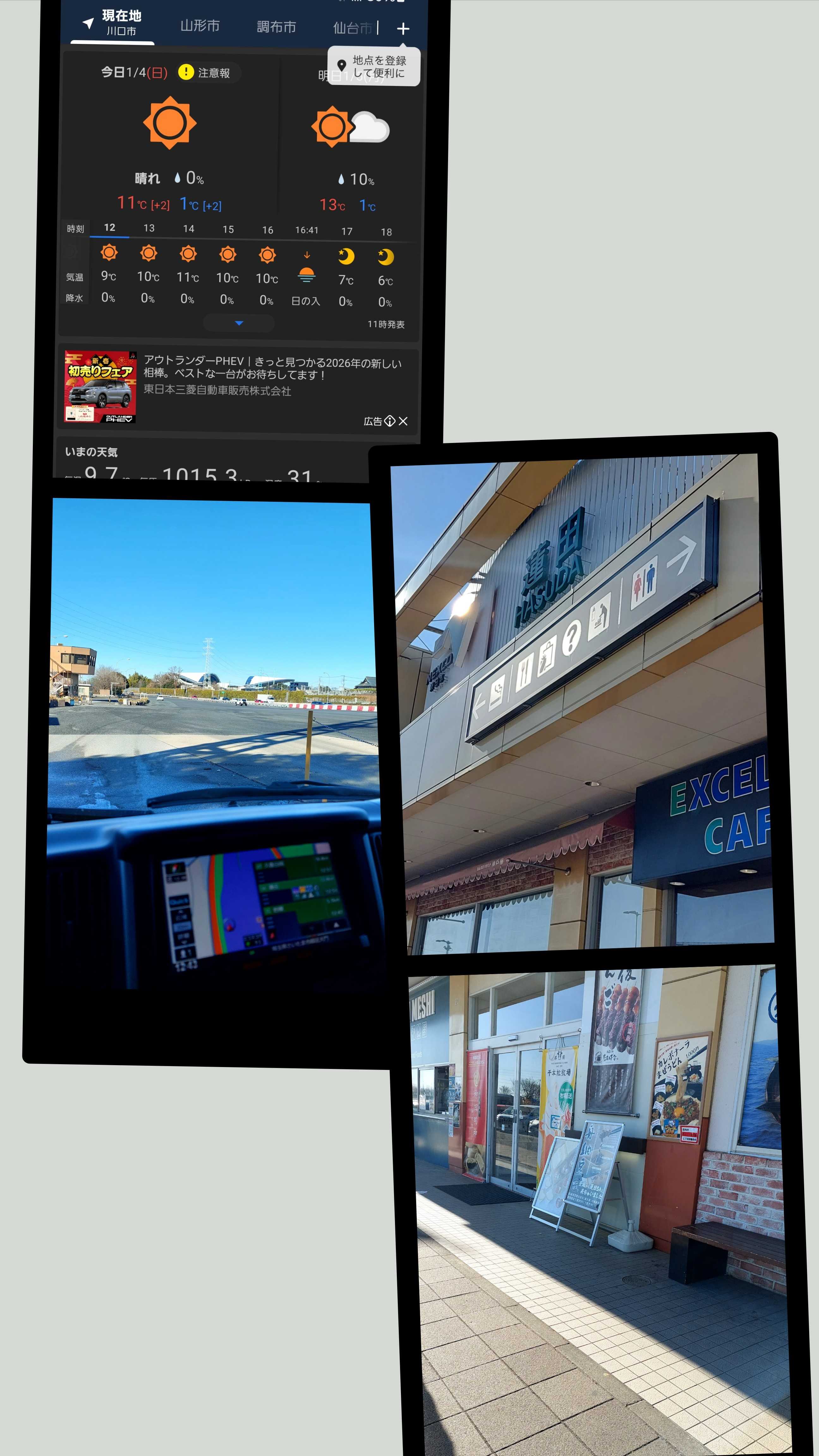 おはようございます♪もう週末−−−−−−−母連れて買い物day行って来ます👋長いようで短いような、、あっという間に1月3日になってしまってというお話●この日朝食べてから、息子が起きて準備後前日、2日に実家へ行けなかったから東京へ帰る前に実家のじいちゃんばあちゃんに顔出してからと言うので●実家へちょっとかと思いきや、40分−−−−−−−なかなか長いんだな外(車内)で待ちまして12月に実家付近でドドドドと工事していたのはコレだったか。道路に穴あけ、下に穴作って?グレーチングが等間隔で見えました。雨水とか道路上流れて冠水する問題があったからな−−−−−−−下水流れるようにしたのかなこれは新しい−−−−−−−🆕文🙆明 🙆開化その後、息子の希望でシベールに寄って●お年賀ラスク●チョコレートラスクル、芋煮風プチラスクその他の焼き菓子も購入してきました息子付近では、有名なガト◯フェス◯◯ラ◯はあるんですって!でも食べたくなるのは食べ慣れたシベール、、、シベールのを手に入れるのは都内では銀座行かないと無いんですと。りんご🍎は山形産買うと言うしふるさと納税さえも山形県にしているというふるさと愛ですからねとにもかくにも体調が回復してきて何よりではあるんですがもう1時間は早い出発したかったな(-_-;)さて11時にようやく出発●右下 あの人兄やんごかと思ったら別人で本人が横から来てびっくりした夫婦です●福島県国見でもうお昼だよパパは運転しながらずっと車内でお菓子バクバク食っててお腹空かないと言うし息子もまだいいって言うしつまんないのーーおにぎりに黒豚シュウマイ買ってきた(∩´∀`)∩ワーイおにぎりは140円、シュウマイ今や500円もするんですか(・。・;レストランは激混みだし、落ち着いて車内にていただきます私用のおやつに、宮城県のおむすびせんべいざらめ●あの白いところはスキー場?何?あの山は?ってところで、まだまだ旅は始まったばっかりでいくら亡猫でも付き合いきれないから私はお留守番よね無事を祈ってるけどにほんブログ村O型日記ランキング