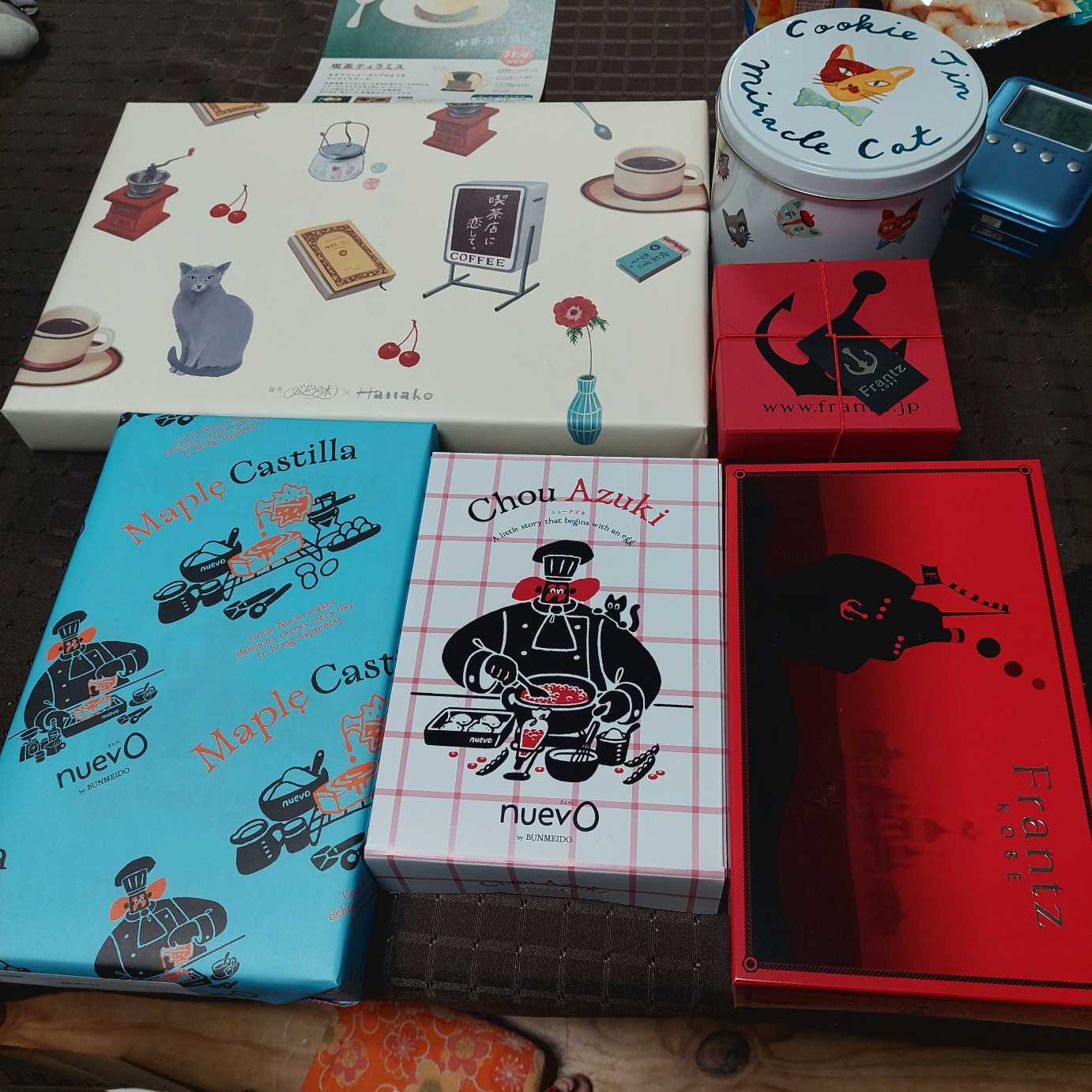 おはようございます♪数日前の忙しい日に、スマホでSDカードに書き込み出来ないという表示が出たのでSDカード取り出すあのピックで、、、とやってみるも開かずーーーーしばらくぶりだからか?開かずの扉になってる(´ε`;)ウーン…次女の助けを得ながらいろいろやるも、、🤷♀️降参🤷と言うことでひっさしぶりにSHOP行くことにしたんですけどお気に入り店舗は閉鎖してしまい、さらに遠くをオススメされたんだけど無視☓最寄りは本当にいつも満員で予約取れず^^;比較的行けそうな店舗の予約が無事とれたので、そのぐらいになったら行って来ますタイトルの通り息子が帰省したとき、自分の荷物(着替え、持ち物)の数倍の重さになってしまって、、というお土産先日はクリプレ🎁&私の誕プレ🎁を公開しましたが今回はお菓子である🍪🍬●帰ってくるだけで十分なのに、こんなに買ってきてくれて●文明堂 nuevO メイプルカステラ、シューあずき●銀座ぶどうの木 喫茶店に恋して ショッパーが可愛い❤ネーミングがいい👍️箱にもワクワクなんですが、3種類入ってるのも楽しい−−−−−−−(∩´∀`)∩ワーイ●一つ開けてみました可愛い−−−−−−−♥サブレの上に、はちみつ香るチョコでハニートーストになっていますパンじゃなくてサブレが、頭バグるけど、サクサクのサブレもチョコも美味しかったです●神戸フランツ神戸苺トリュフ、魔法のキャラメルサンド●苺トリュフ食べてみましたミルク感あり、クリーミーなホワイトチョコに、ドライ苺が甘い😛こういう苺チョコのドライ苺って酸っぱいのが多いんですけどこれは苺の完熟したような風味、チョコレートの存在感があって好きかも❤今まで食べた苺トリュフでNo.1だわ次は実は一番気になっていた●神様のいたずらネコクッキー缶いろんな猫がいます𓃠クッキーは5種類、発酵バタークッキー、ほんのりカカオのアールグレイクッキー、アールグレイクッキー、カカオクッキー、ほんのりカカオの発酵バタークッキーこれはミュージシャン坂本美雨さん、イラストレーター前田ひさえさん、フェアリーケーキフェアのプロジェクトで出来たクッキーだそうです●この猫缶可愛い❤(私のもの−−−−−−−)昔からこういうお菓子の缶って捨てられなくって下の2つには編み物用の細々したの入れてるぐらい※かれこれ平成初期のもの●−−−−−−−と言うことで、買ってくる本人さえお初のお品全て解体し、息子にも分けて一部おやつとして味わったのでしたにほんブログ村O型日記ランキング