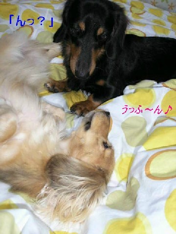今日の2Wanレオン5.80kg パール4.30kg何だか今日は食欲が無く、朝食抜きで昼食はコンビニのケーキ1個を無理やり食べました。美味しかったのは半分まで。(;-_-) =3 フゥ元気を充電しにナミちゃんの子犬を見に行く私。娘付きで~。昨日も会いに行ったのに最初はやっぱり警戒するナミちゃん。おいおい私はレオンのオーナーだぞ~。覚えてよ~。取ったりしないわよ。(* ̄m ̄) ププッジ~ッと見つめてたら、ナミちゃん毛布で子犬を隠すしぐさ。はいはい、帰りますよー。マタネ!(゜-^*)/~ と、今日は数分で失礼しました。昨日は何時間も居たのに・・・少し物足りないわ。(;-_-) =3 フゥ帰ってからレオンとパールにお帰り~♪の大歓迎を受け気分が良いので「リンゴ食べるぅ~?」って先に犬に聞いてパパにも聞いたら「食べる」って言うんで、むいてあげました。(先にパパに聞いてあげるべきだったかしら~?f(^^;) ポリポリ)パパと私は2切れずつ食べて、後はWANに小さく切ってあげました。お陰で2Wan共、見事に昨日より体重増えてます。(*〇o〇*)ゞ ガーン!あ、レオンはその前に息子の残したバームクーヘンの周りの砂糖のついてた所を残してたので盗み食いしました。イスに飛び乗る事覚えちゃって~。どこにも置いておけないわ。せっかく痩せたんだもん。5kg台はキープしなきゃだわ!