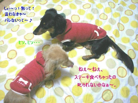 今日の2Wanレオン6.00kg パール4.10kgお~っと、レオン危険な体重だぁ~!6kgだぁ~。カラス化したなぁ~。o(´^`)o ウー!ダイエットだぁ~!!!朝起きたら吐き気が襲ってきた私。( ̄□ ̄;)ガーン!「おとーさん・・ナイロン取って・・吐きそう・・・。」o(__)o~† パタッそのままナイロン袋を握りしめて寝てしまった私。パパは今日は遅くなる様で、夕飯に何もしなくていい様にステーキを焼いておいてくれました。o(^o^o)(o^o^)o ワクワク私と息子と娘の分。v(≧∇≦)v イェェ~イ♪ところが昼前に起きた私が見たのはステーキの入ったお皿が2枚と何も入ってないお皿が1枚。(*〇o〇*)ゞ ガーン!ヤラれたぁ~!!!どっちが食べたか体重を量ってみた。フフフ ( ̄+ー ̄)キラーンイスに乗れるのはレオンだけだけど、体重はパールも共犯と物語っていた。2WANは0.1kgずつ増えていたのです。(;-_-) =3 フゥお陰で私はステーキが食べられなかった。(┰_┰) ウルルルルル大事件だわ~~!( ̄ヘ ̄)凸 ムカッ!!!キッチンを閉鎖したいけど閉鎖できませ~~ん!室井さ~~ん!何とかして~~~~~!バレてるっつーの!( ̄ヘ ̄)凸 ムカッ!