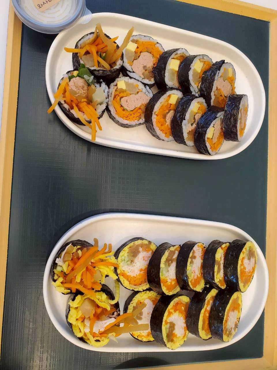 金曜日の仕事の持ち帰りを一通り終えて、土曜日にも仕事があったので、準備をして、そろそろ寝ようかな、という時に長女が突然、帰ってきました。明日(土曜日)の午後6時ごろって言ったよね?!と言ったらサプライズ!だそうで。サプライズって嫌いなんだけど!この日は寝るだけでしたが、翌日の土曜日は夕方の6時までに帰ってこれば良いか、と思って、でかける準備もしていたのですよ。でも、急遽、家からオンラインで参加することにしたのです。予定が狂うでしょ!土曜日の朝は、いったん、朝マックをデリバリーしてわたしはオンラインのために部屋にこもりました。午後1時すぎ、いったん終わったので、お昼にでかけました。この海苔巻、ごはんじゃなくて、たまごが選べるんです。「キト海苔巻き」とかいう名前です。この海苔巻き屋さん、京畿地域貨幣=地域活性化カード=民生回復カードって呼ぶらしいです。この支援金が入金されたカード、期限があるので、支援金で支払いました。海苔巻きを食べてEマートへ。Eマートで買ったのはみかんの形をしたパンです。インスタで見たんです。冷凍で「あんまん」みたいな生地でした。この後、コストコへ。コストコで、Mサイズのジャージの上下を買った長女。家で着てみたら、ぴったり。ぴったりすぎない?Lに交換したら?と言ったのですが、翌日はなんと定休日。それを知らない(調べなかった)わたしは翌日、一日中、ジャージの上下を持ってソウル観光することになりました。つづくつづきは夕食です。