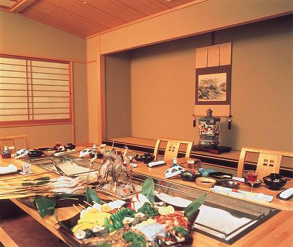 みなさま、こんにちは~今日も半分終わりましたね、残り半分も元気にいきましょー本日は当館でご用意している和食料理の中で、最も豪華なお料理をご用意します(^▽^)そのお料理の名前は「いろり焼」。名前のとおり、いろりにてお魚やお肉を焼いて召し上がって頂くお料理です。こちらがいろり焼のお写真です。華やかで豪勢だと思われませんか(?▽?)お祝い事などで、当館をご利用のお客様にオススメですこちらのお食事を召し上がって頂けるレストランが下のお写真になります。「松柏亭」と申しまして、この建物の中に6部屋個室があります。そちらの個室の中で、いろり焼を召し上がって頂けますよこちらの松柏亭は他のレストランと異なり、当館の中庭に「別邸」として建っております。お食事内容もお食事会場も特別仕様でございます。お祝い旅行などちょっと豪華な旅をご検討のお客様は、是非一度松柏亭のご利用を検討下さいませ☆・・・今回使用しましたいろり焼のお料理写真は☆イメージ☆です・・・・・・ご利用頂いた際のお料理と、食材など一部異なることがございます・・・*★*―――――*★*―――――*★*―――――*★*―――――*★*松柏亭ご利用にあたっての注意事項(1)特別料理のため、食材の手配などにお時間を頂戴しております。 ご宿泊日の三日前までにご予約をして頂きますようお願いします。(2)松柏亭の個室は6名様までしか入って頂けない小さな個室です。 人数が多い場合は別の会場での別料理を提案させて頂くことがございます。*★*―――――*★*―――――*★*―――――*★*―――――*★*
