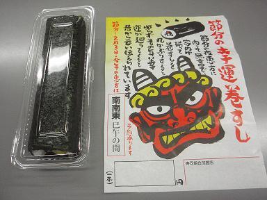 こんばんは~。すっかり暗くなりましたね今日は節分ですね(^▽^)みなさん、鬼に豆をまいて退治しましたかまいた豆は年の数だけ食べないといけないらしいですね。小さい頃は豆の数も少なくて、美味しいとだけ思って食べていましたが・・・年をとるとお腹はふくらみ過ぎるし、年齢を実感してちょっとしんみりしたり(笑)私の友人には「たくさん豆食べられるんだから、年齢は上の方がいい」という、強者がいましたせっかくの日本の伝統をちょっとネタにしてしまったので、真剣な話に持っていこうかと思います。みなさん、節分の太巻きを知っていますか?恵方の方角を向いて黙々と太巻きを食べるのです。絶対しゃべってはいけません。これは、関西地方だけの慣わしだと聞いているんですが、どうなんでしょうね(?▽?)今のところ、うちのホテルの関西地方以外の出身者は「淡路島に来てから初めて知った」と答えた人ばかりなので、関西地方だけなのだろうと思っているのですが、気になるところです。上のお写真は、当館の和食厨房スタッフが作った太巻きです。従業員も買っていいとのことだったので、購入いたしました。これから家に帰って、黙々と食べます!!!