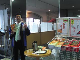 こんにちは~ 今日は比較的はやめにお会いできましたね(^▽^)ノ今日ご紹介するのは、毎朝8時ごろに現れる出張販売スタッフのお話です。なにを出張販売するのかというと、ショッピングプラザの商品です。その季節の一押しの商品をショッピングプラザからピックアップして持って参りますよ写真のように、はっぴを着たお兄さんや青いスーツを着たお姉さんが、「おはようございます。たまねぎスープはいかがですか?」とお声を掛けておりますので、是非お立ち寄り下さい。ちなみに、冬はたまねぎスープととうがらし梅茶を販売していますよ(○^▽^○)たまねぎスープは当館ショッピングプラザの中でも、常に一番人気を誇る有名商品!!出張販売所では、試飲もしておりますので一度お飲み下さいね☆