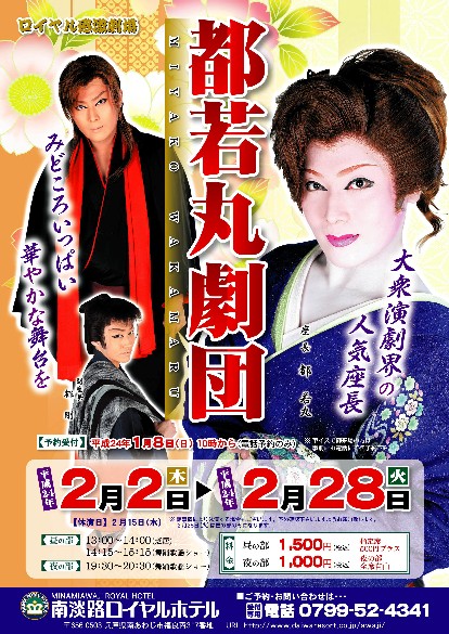 皆様大変お待たせ致しました毎回ご好評を頂いております観劇ですが、2012年2月に再び公演を行います今回お招きするのは「都若丸劇団」 です歌あり、踊りあり、笑いありの華やかで楽しい舞台をお楽しみ下さい<公演日時> ◆ 2012年 ◆2月2日(木)~2月28日(火)※休演日2月15日(水)※2月28日(火)は昼のみの公演となります。【昼の部】お一人様1500円13:00~14:00(芝居)14:15~15:15(舞踊歌謡ショー)※指定席はプラス500円にて承ります。【夜の部】お一人様1000円19:30~20:30(舞踊歌謡ショー)※全て自由席となります。※ご予約の受付は2012年1月8日(日)午前10:00より専用お電話番号でのみの受付となります。※他のお電話番号にかけて頂きましてもご予約を承ることが出来ません。かけ間違えの無いようご注意下さい。▼ 観劇専用ご予約番号はこちら ▼TEL:0799-52-4341後日観劇付き宿泊プランを販売予定でおりますのでまたご紹介させていただきます皆様のご来館を心よりお待ち申し上げております