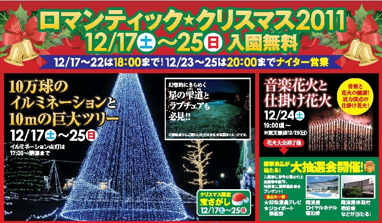 ホテルよりお車で約25分の位置にある、観光スポットとしても人気の「淡路ファームパーク イングランドの丘」ですが、なんと!12月17日~12月25日は【ロマンティック★クリスマス2011】ということで、終日入園無料となっていますその期間は巨大ツリーや、「星の雫道」題したイルミネーションなど期間限定のイルミネーションやイベントも予定されており、12月17日~22日までは10:00~18:00、12月23日~25日は20:00までとナイター営業もしているのでクリスマスムードたっぷりで楽しむことができますよ~ちなみに巨大ツリーの点灯は17:00~閉園までとのこと。この時間帯に合わせて訪れてみても満喫できそうですねさらに!12月24日には19:00頃(雨天順延25日)より花火大会もありますホテルのチェックインは21:00や22:00頃でも可能なので、ちょっと寄り道されてからでも大丈夫ですよ(ご夕食のご注文のある方は除く)イングランドの丘では12月1日~2月29日まで入園料半額で楽しめますが、12月17日~12月25日のこの期間ははさらにお得ですホテルへお越しになる前に、ちょっとお立ち寄りされてはいかがですか詳細につきましてはこちらへお尋ね下さいませ<淡路ファームパーク イングランドの丘 >〒656-0443 兵庫県南あわじ市八木養宜上1401番地TEL:0799-43-2626FAX:0799-43-2622【公式HP URL】 http://www.england-hill.com/