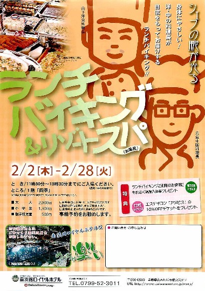 2月2日(木)~2月28(火)まで洋食と中国料理をお楽しみ頂けるランチバイキングを行いますお好きなものをお好きなだけ是非ご利用下さいませご利用頂いたお客様にはこちらの特典付特典・お一人様につき1枚の温泉入浴券(3月末日まで有効)※大浴場は12:00~のオープンとなります・エステサロン「アヌビス」の10%オフチケットプレゼント※女性限定。アヌビスの営業は13:00~となります(水・木曜日定休日)場所:1階レストラン「四季」時間: 11:30~13:30までにご入場下さい。(最終14:00まで)料金: 大人様2000円 小学生1300円 就学前幼児500円※各料金には、税金・サービス料が含まれます。※お飲み物代は別途頂戴致します。当日ご精算下さい。※混雑時はお待ち頂く事もございますのであらかじめご了承下さい。事前ご予約も承っておりますので、ご希望の方はお問い合わせ下さいませ。この期間は「都若丸劇団」様をお招きして、観劇の公演も行いますお昼の部の公演時間は13:00~14:00が芝居、14:15~15:15が舞踊歌謡ショーとなりますのでこちらも是非お楽しみ下さいランチバイキングと観劇の入場券付きのご宿泊プランもございますので、お得にゆっくりとお楽しみになりたい方にオススメです皆様のお越しをお待ち申し上げております宿泊プランのご予約はこちらhttp://web.travel.rakuten.co.jp/PLAN/40154/2102405