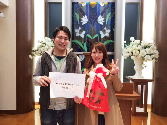 今日はとっても嬉しくもあり、うらやましくもある出来事をご紹介致します!後一週間でバレンタイン♪当ホテルでは宿泊プランとして、「バレンタインプラン」をご用意しております!そんな中、本日1組のカップルが「バレンタインプラン」でのご宿泊でお越しになられました。当初、彼へは宿泊プランの事は内緒でご予約をされた彼女。。ですが、何らかのかたちで予約を知った彼はサプライズを計画!!サプライズとは、、正式にプロポーズをしていなかったので、きちんと気持ちを伝えたい!ということで、「サプライズプロポーズ作戦♪」ご夕食後、一旦お部屋に戻られて、車に忘れ物をしたと言い彼女を一人にして打合せ。。挙式のご予定が決まっているお二人でしたが、「チャペルを見に行ってみよう」と誘い出し、サプライズ始動!!チャペルに入り、バージンロード進んで行くと、何やら小さな箱が、、そばまで行ったところで、告白タ~イム!プロポーズの言葉を言った後に、小さな箱から取り出したのは、、「「指輪」」 でした。思わず彼女も目からこぼれるものが、、、お返事をもらって、ネタばらし~笑本番前、とても緊張されていた彼でしたが、成功して良かったですね♪たかのりさん・なつきさん本当におめでとうございます!末永くお幸せに...今回のサプライズ、想いを伝えることってとっても大事なことだし、とっても素敵なことですよね。。当ホテルでは、プロポーズしたい!という方を応援します!勇気を出して、大切な人へ想いを伝えませんか??いつでもご相談お待ちしております。。ブライダル担当 なっちゃん