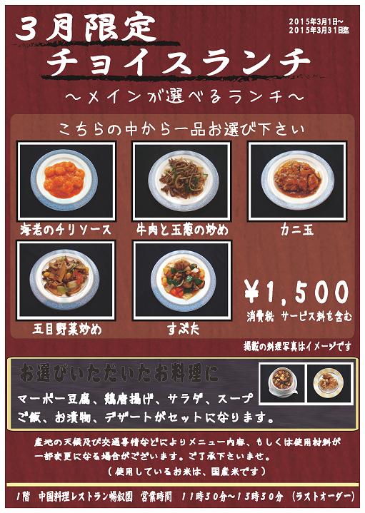 中国料理レストラン“暢叙園(チャンシュウエン)”が贈る★メイン料理5種類より1つ★をお好みでお選び頂ける【3月限定】のランチメニューです!お好みのメニューで素敵なランチタイムをお過ごし下さい♪< 5種類のメイン料理 >・海老のチリソース・牛肉と玉葱の炒め・カニ玉・五目野菜炒め・すぶたお選びいただいたお料理に「麻婆豆腐」、「鶏唐揚げ」、「サラダ」、「スープ」、「ご飯」、「お漬物」、「デザート」をセットメニューとしてご用意致します。 ◆ 3月限定 チョイスランチ ◆◆ 一人前¥1,500(消費税・サービス料含む) ◆【中国料理レストラン暢叙園】場所:ホテル1階営業時間:11:30~13:30ラストオーダー(14:00クローズ)※写真はイメージです。※産地の天候及び交通事情などによりメニュー内容もしくは使用 材料が一部変更になる場合がございます。ご了承下さいませ。※料金にはサービス料・消費税が含まれております。