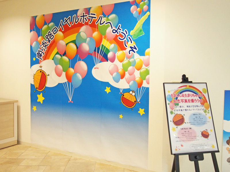 ご旅行の記念に、たまくん&たまりちゃんと一緒に記念写真はいかがですか♪ホテル1階ロビー、エレベータ裏のスペースにフォトコーナーをご用意しています☆ヽ(´∀`*)ノ上手に撮影すると、こーんな・・・風船で空を飛んでいるような写真が撮影できますよ~~~☆右のUさんは手が風船から離れてるので、落ちてますけどね。(´、ゝ`)いろいろなポーズで楽しんでね♪ヽ(´∀`*)ノ