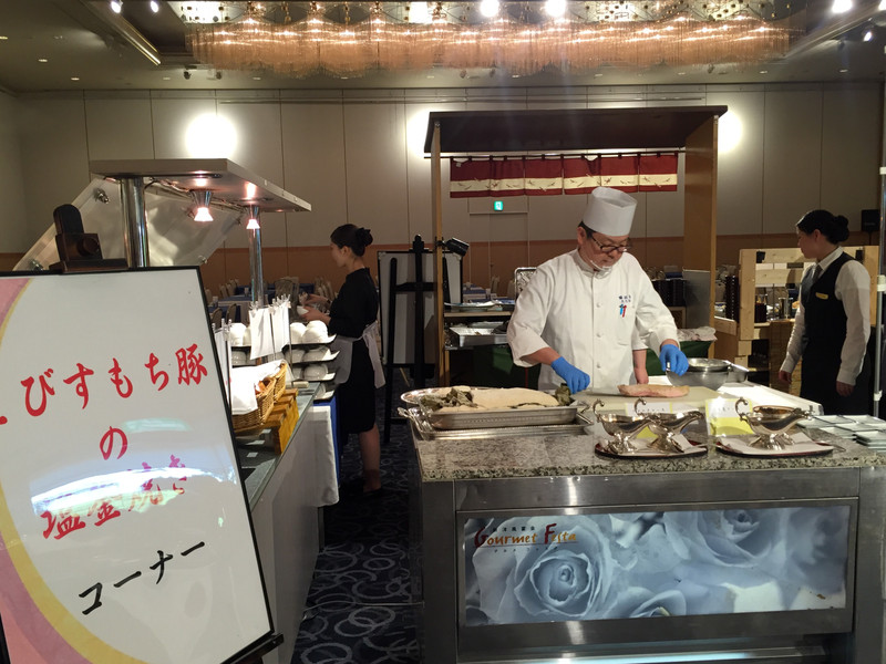 4月29日~5月4日まで開催中の和洋中ディナーバイキング!毎日たくさんのお客様にご利用をいただいておりまして、30日はお席が満席でご用意が難しいなんて日もありました。そんなディナーバイキングのお料理とお食事会場をご紹介させていただきます。まず、調理スタッフがお客様の目の前でお料理をご提供するパフォーマンスコーナーです。こちらは29日のバイキング初日に撮影致しましたが、中国料理長の大久保料理長が自らパフォーマンスを行う「えびすもち豚の塩釜焼き」。えびすもち豚は、以前コバコバさんのブログでも紹介がありましたが、淡路島の大自然の中、のびのびと育てられた三元交配された豚です。飼料に米や穀物よりも糖質の高いバナナを使用されているため、かむと甘味が口いっぱいに広がります。玉ねぎソースとにんにくソースがありますが、お好みでお召し上がりくださいませ。ちなみに私はご飯がすすむ、にんにくソースがおいしかったです。続いて、天婦羅コーナーです。こちらでは、淡路島の特産の玉ねぎと鳴門金時をお召し上がりいただけます。玉ねぎと鳴門金時がもつ野菜本来の甘味とマッチする、5種類のお塩からお好みのお塩を見つけてみてくださいね。お魚好きのお客様はお造里コーナーへGO!やっぱり淡路島へ来たならおいしいお魚を食べたいですね。忘れてはならないのがデザートコーナーです!お腹がいっぱいでもデザートは別腹なお客様も多いはず。笑冷たいアイスクリームもございますので、今日のような夏日にはぴったりですね。最後に、せっかくのご旅行で気兼ねなくお酒を飲みたいお客様へは飲み放題プランもご用意しております。生ビールはもちろん、サワーやカクテル、焼酎、日本酒、梅酒にワインなど様々なアルコール飲料をお楽しみいただけます。飲み放題ではなく、1杯ずつのオーダーもOKですのでぜひご家族やグループお楽しみくださいませ。なお、今年からソフトドリンクは指定のジュースが飲み放題の機械を導入致しました!そちらもぜひご利用くださいませ♪お食事会場は日によって変わる場合もございますが、本日5月2日のバイキング会場はリニューアルした1階「ロイヤルホール」です。ぜひGWのご旅行のひとときを、南淡路ロイヤルホテルでお楽しみくださいませ♪ブログ担当キキでした♪